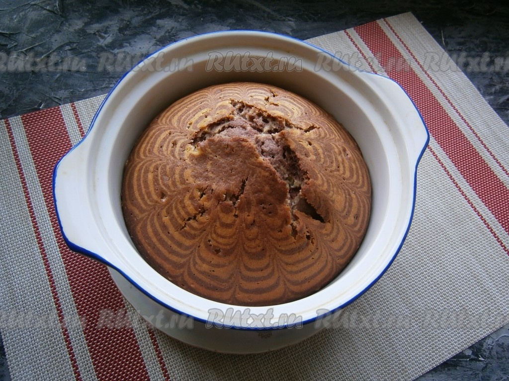 Духовку разогреть до 180 градусов и выпекать пирог "Зебра" 35-45 минут. Проверить его готовность можно деревянной шпажкой - после того, как вы проткнёте пирог, она должна остаться сухой. У меня пирог получился с чуть рваной шапочкой от того, что была маловата форма (я выпекала в форме диаметром 17 см, поэтому форму берите побольше - 19-20 см).