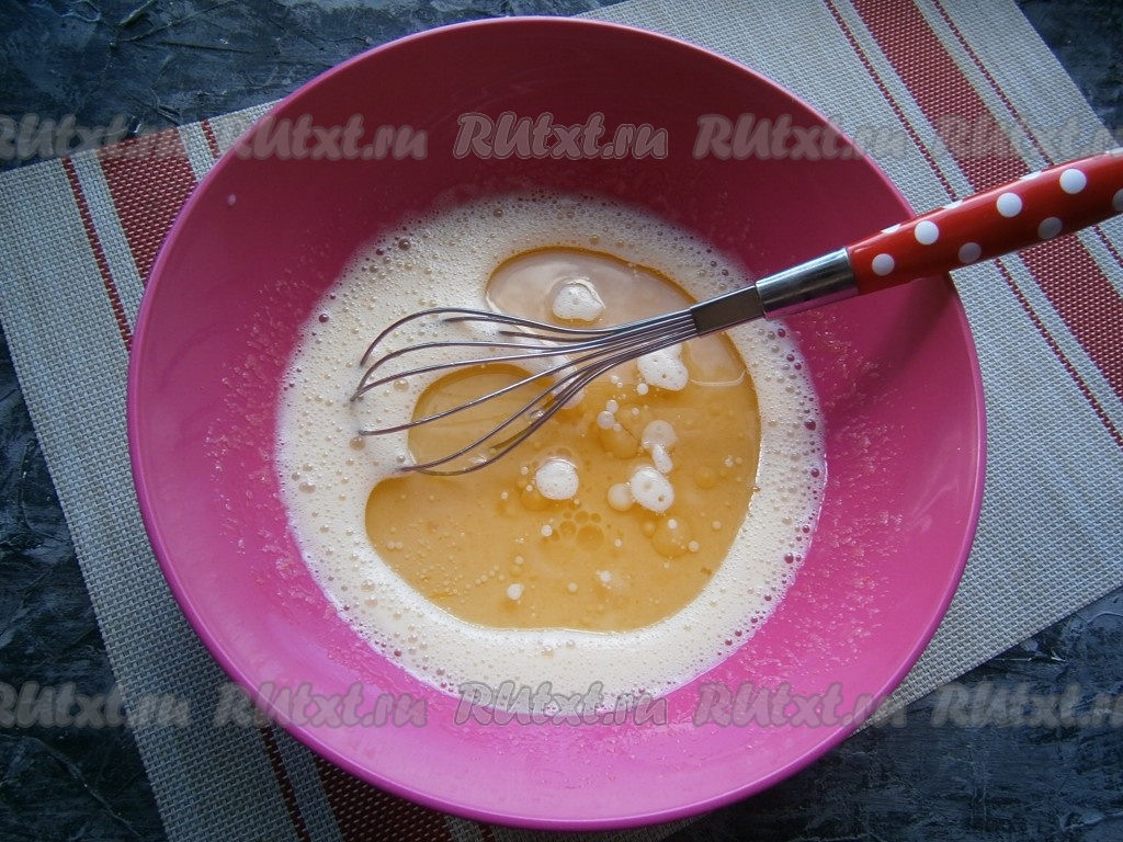 Перемешать яично-молочную смесь, влить растительное масло, снова перемешать венчиком.