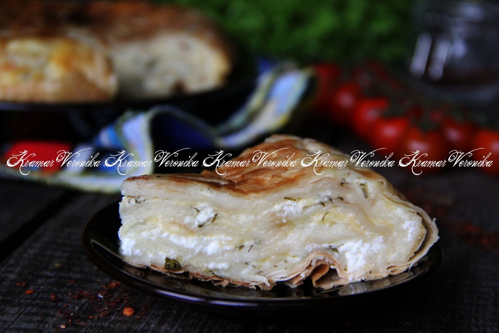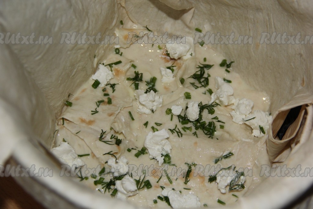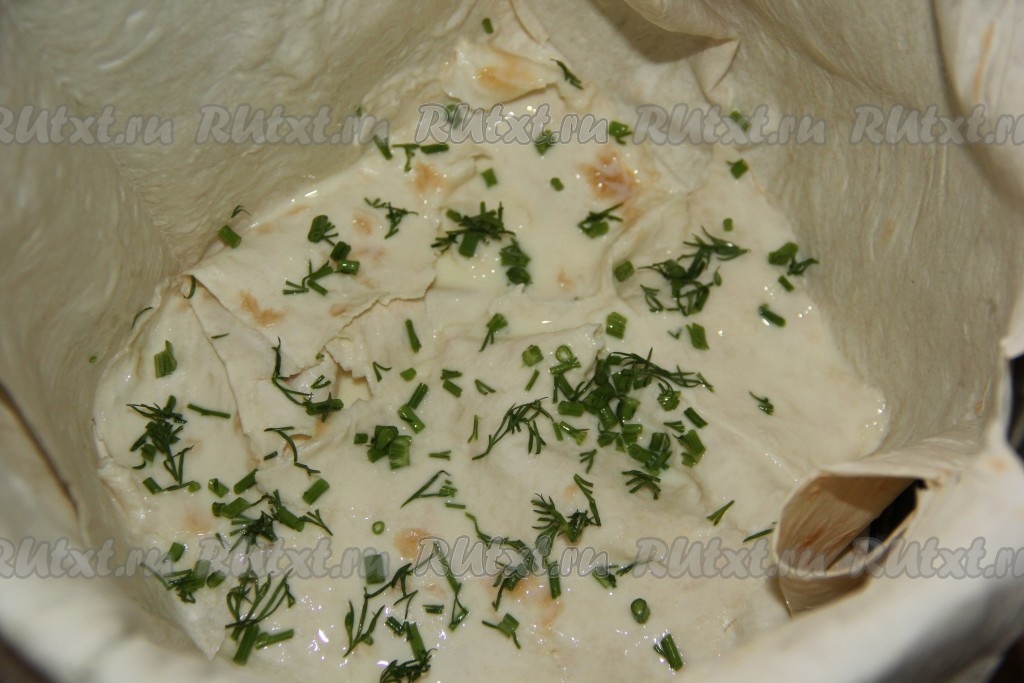 Снова выложить часть кусочков лаваша, замоченных в кефирно-яичной смеси, посыпать частью зелени и сыра. Таким образом, чередуя, выкладывать слои, пока не закончатся сыр и зелень. Вылить сверху оставшуюся кефирно-ячиную смесь с лавашом.