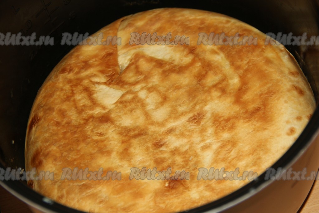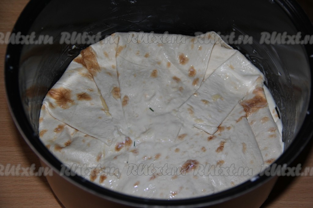 Накрыть лавашом, который свисает с краёв мультиварки, и слегка прижать.