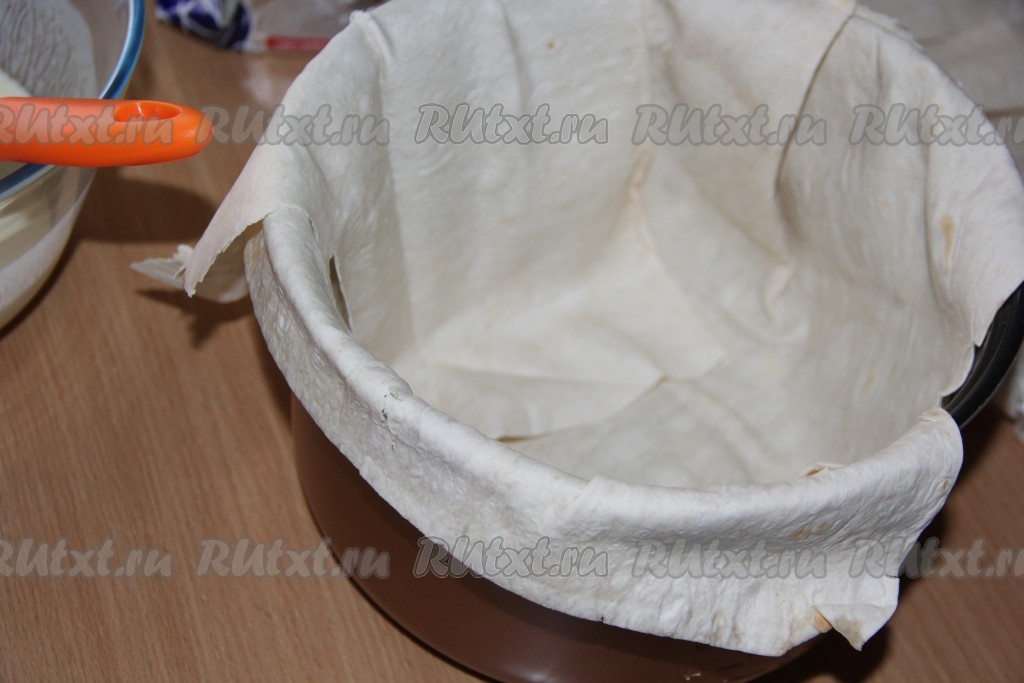 1/2 лаваша выложить в чашу мультиварки так, чтобы концы лаваша загнулись на чашу (как на фото).