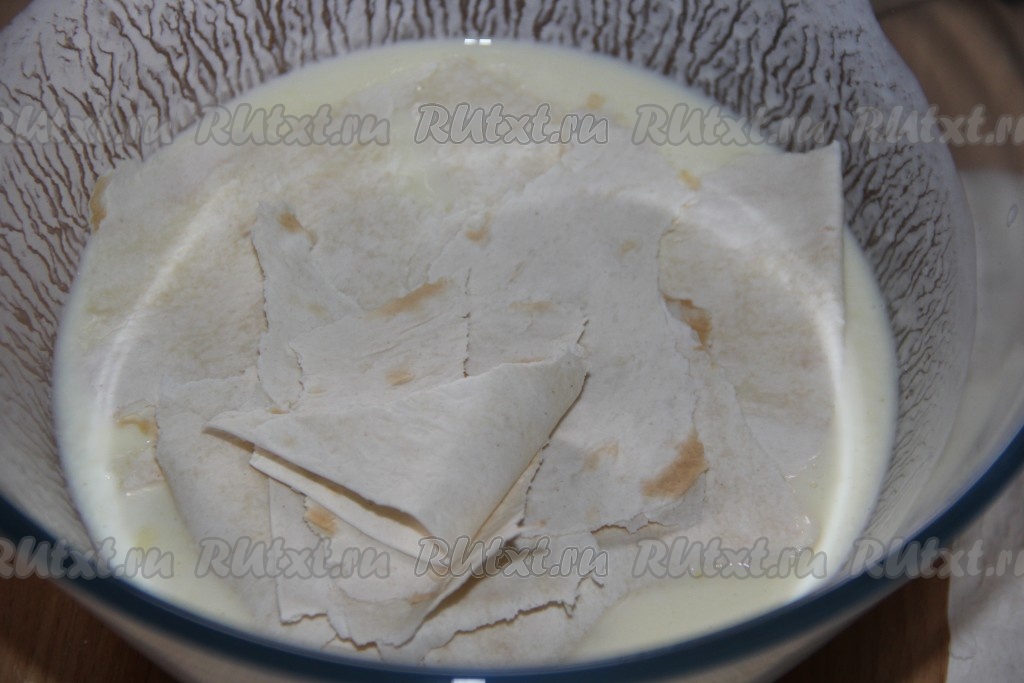 Оставшуюся половину лаваша нарвать на кусочки среднего размера и выложить в кефирно-яичную смесь, перемешать.
