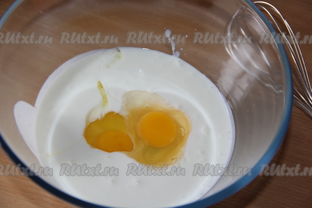 Перемешать получившуюся кефирно-яичную смесь венчиком.