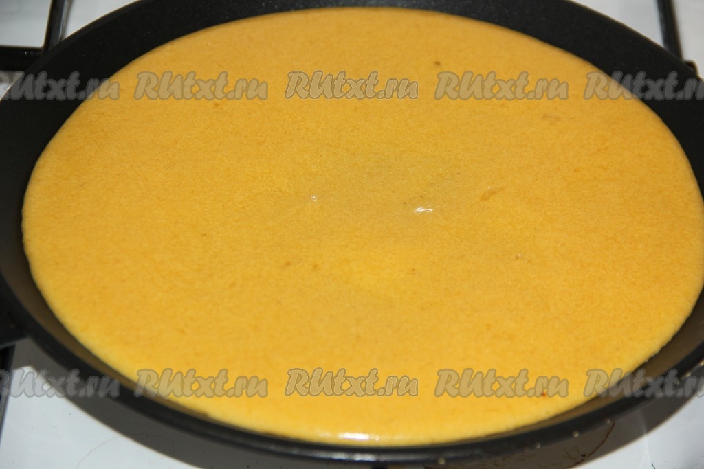 Сковороду (у меня сковорода диаметром 26 см) смазать растительным маслом и поставить на огонь, разогреть. Влить тесто с манкой.