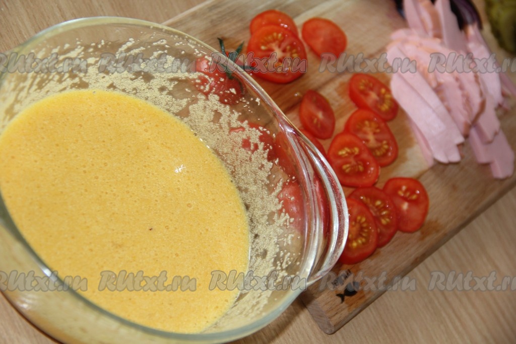 Подготовить начинку, для этого нужно колбасу, огурцы и помидоры нарезать, сыр натереть на тёрке, очищенный лук тонко нарезать.