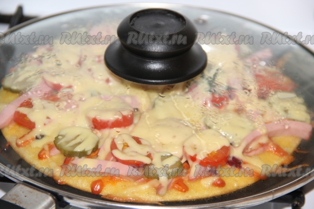 Посыпать пиццу сыром. Накрыть сковороду крышкой.