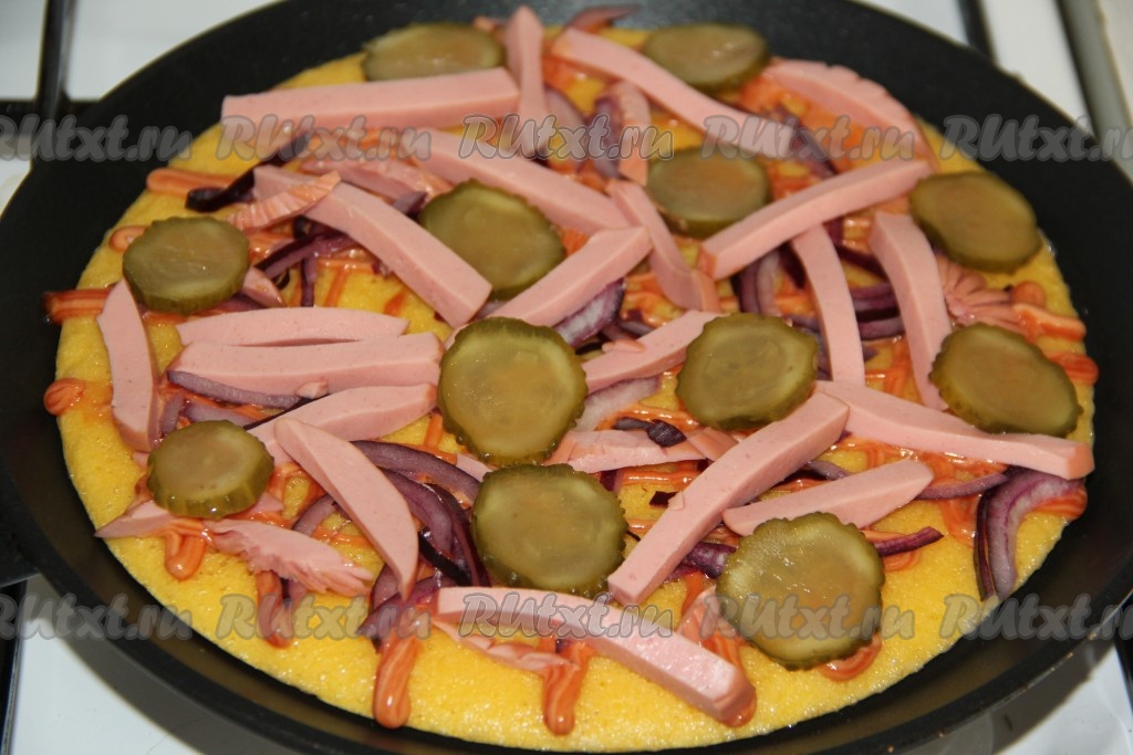На просторах Интернета встретила интересный рецепт приготовления пиццы на сковороде. Тесто замешивается из манки и яиц без добавления муки. В роли начинки можно взять любимые ингредиенты или то, что есть под рукой. Пицца получается и вкусной, и сытной, подать её можно и в качестве перекуса, и на завтрак или на ужин. Всем советую приготовить пиццу по этому рецепту!