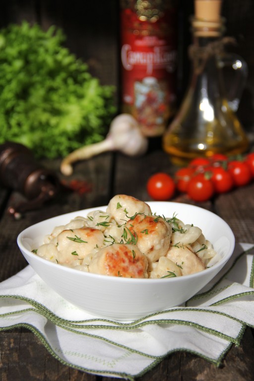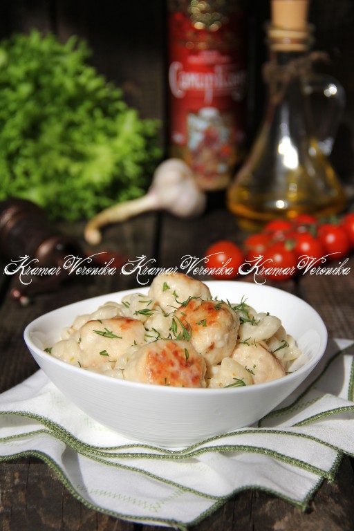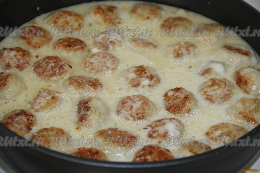 Влить сметанный соус в сковороду с обжаренными куриными фрикадельками. Довести соус до кипения, а затем тушить куриные фрикадельки на небольшом огне под крышкой в течение 15 минут. По истечении времени фрикадельки будут полностью готовы.