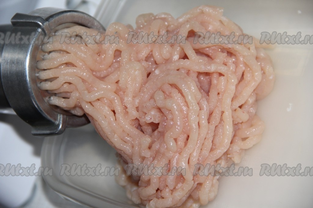 Куриное мясо промыть водой, обсушить, нарезать на части. Кусочки куриного мяса и нарезанную очищенную луковицу пропустить через мясорубку, посолить получившийся фарш, а затем тщательно перемешать.