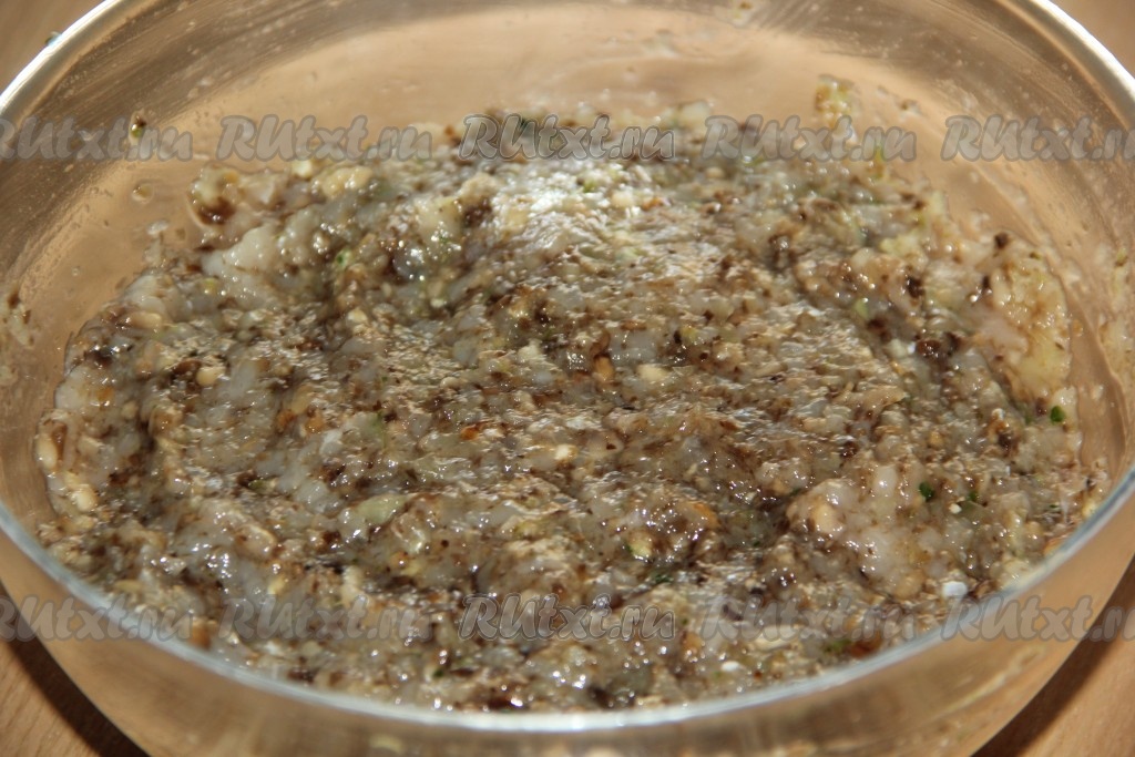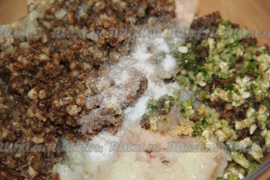 Зелень вымыть и тоже пропустить через мясорубку. Соединить перекрученные мясо с луком, грибы и зелень, добавить соль и специи.