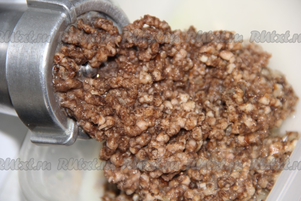 Если вы готовите с лесными грибами, то их нужно предварительно перебрать, отварить в течение 20-25 минут, а затем, слив лишнюю воду, остудить. Если вы готовите с шампиньонами, то их нужно промыть, дать немного обсохнуть. Грибы (лесные или шампиньоны) пропустить через мясорубку.