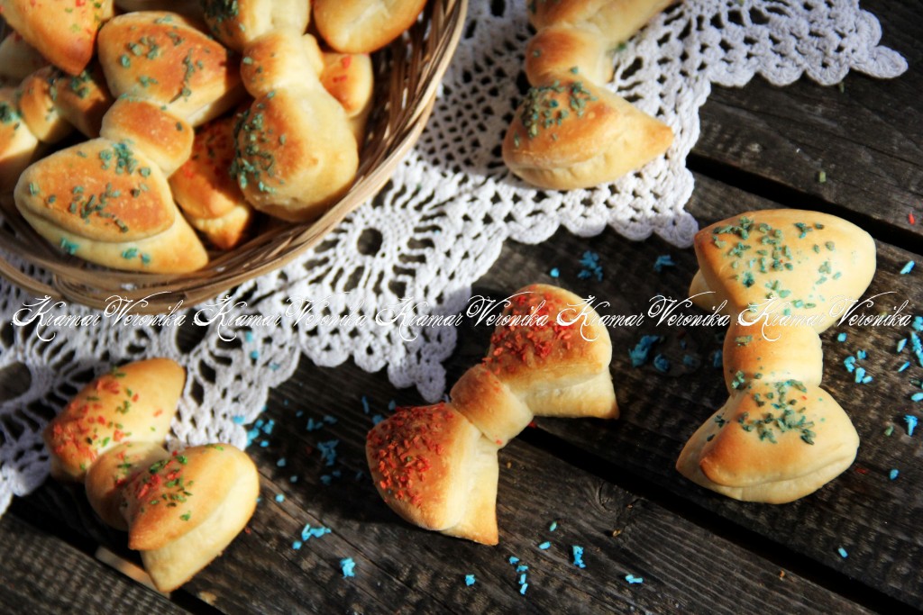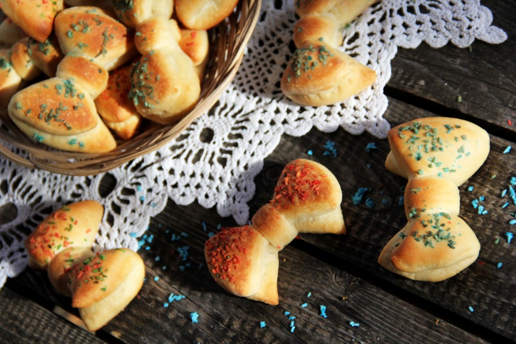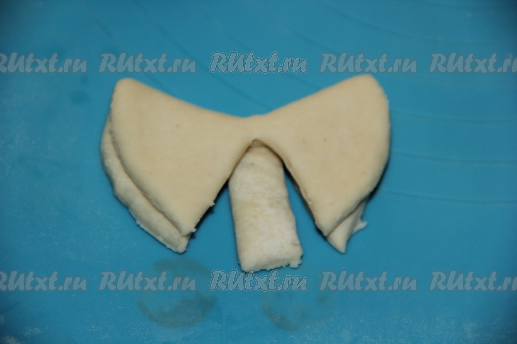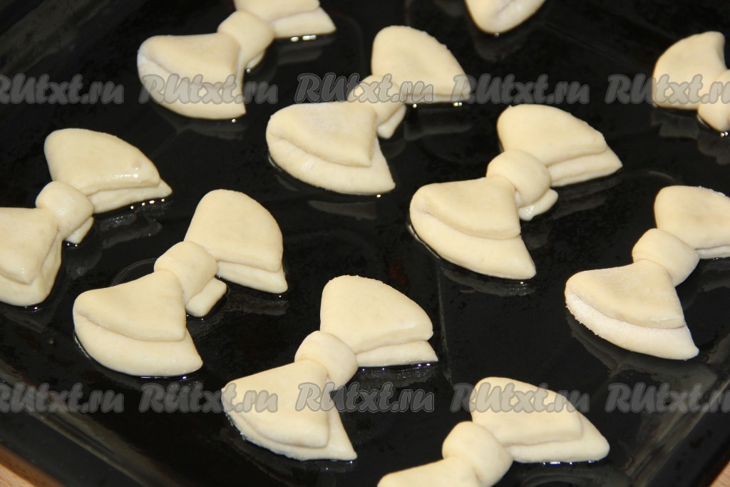 Полоску теста завернуть по середине и подогнуть под бантик. Противень смазать маслом и выложить получившиеся бантики на противень на некотором расстоянии друг от друга.