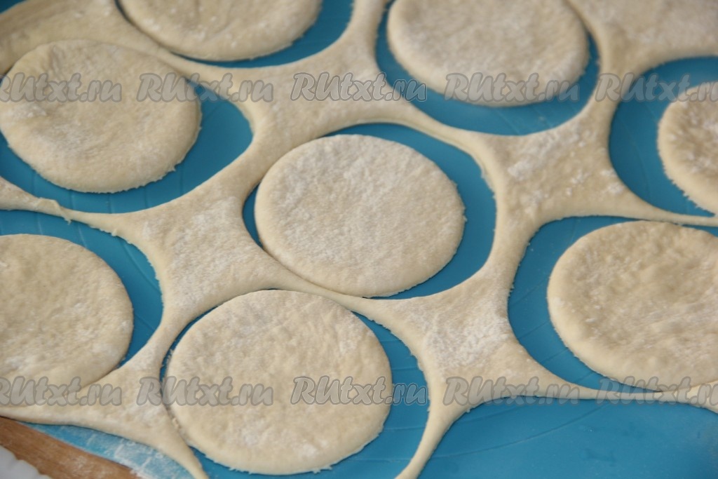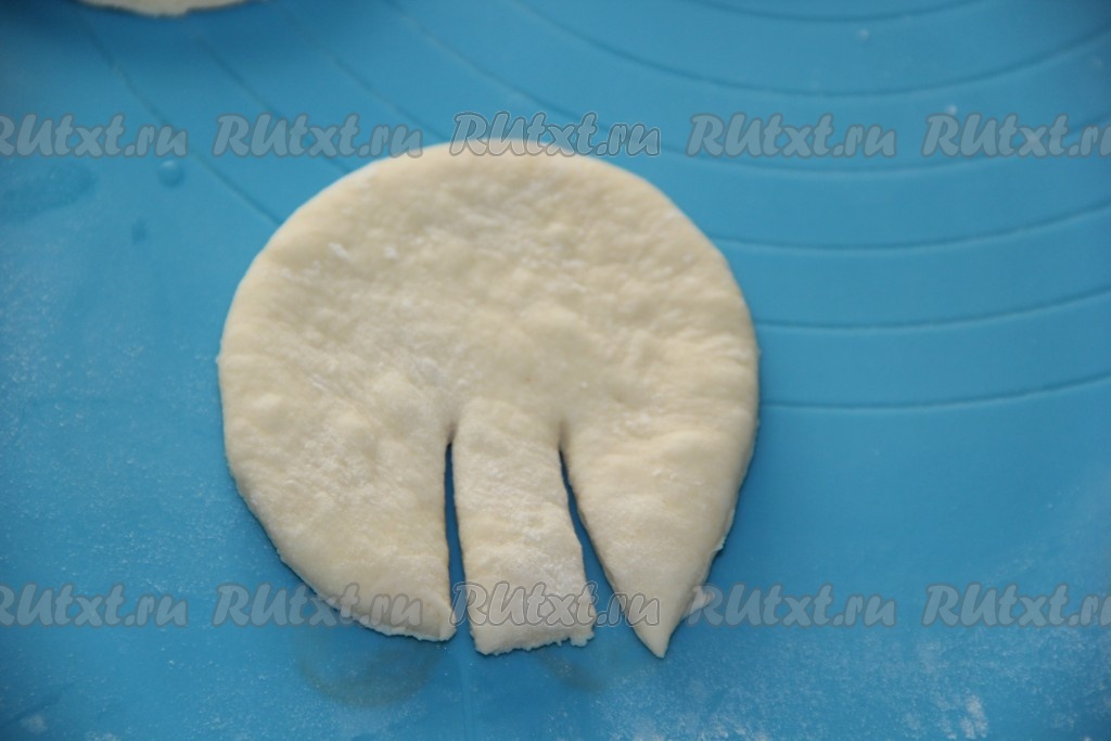Готовое тесто, замешанное руками или с помощью хлебопечки, обмять, а затем на поверхности, немного присыпанной мукой, раскатать в пласт толщиной 0,5 см. С помощью круглой вырубки вырезать кружочки. От размера кружочка зависит размер ваших булочек-бантиков.