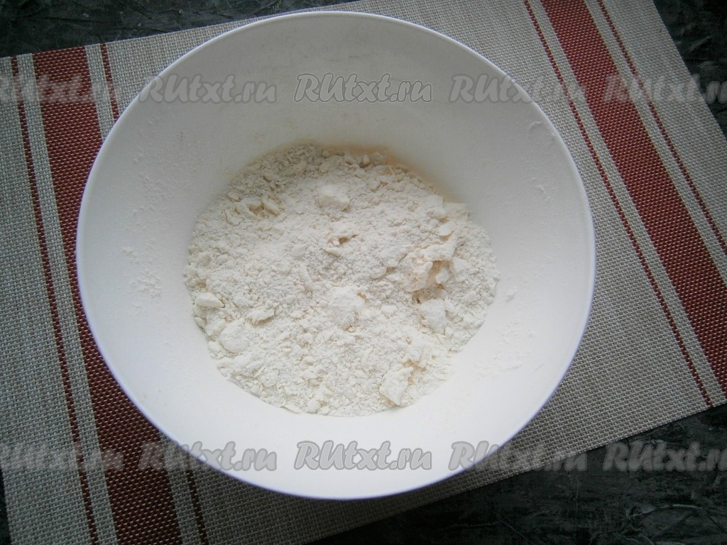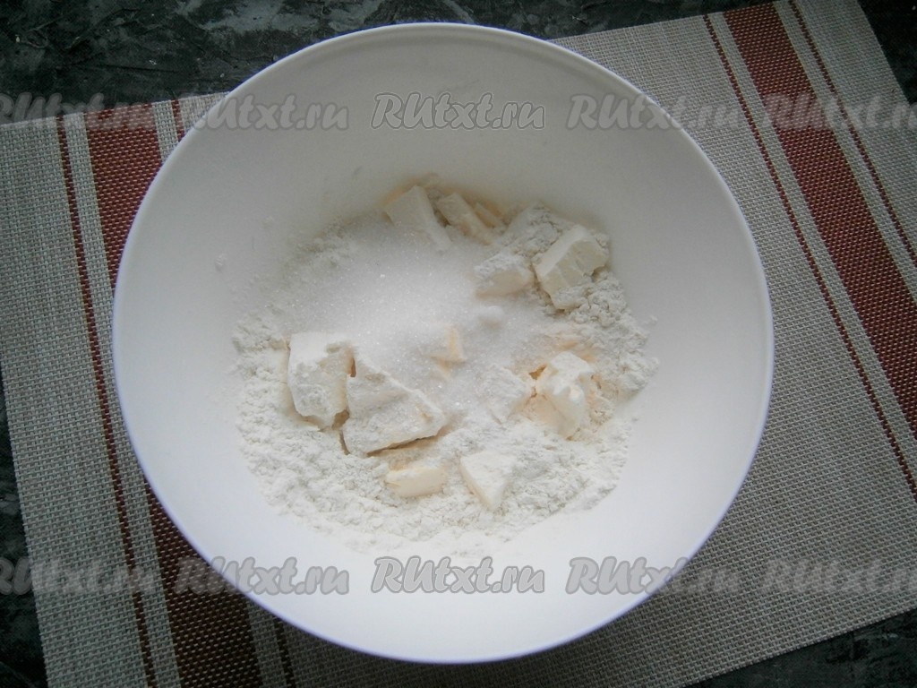 Приготовить тесто-основу: муку насыпать в миску, добавить нарезанное на кусочки холодное сливочное масло, всыпать сахар и щепотку соли.