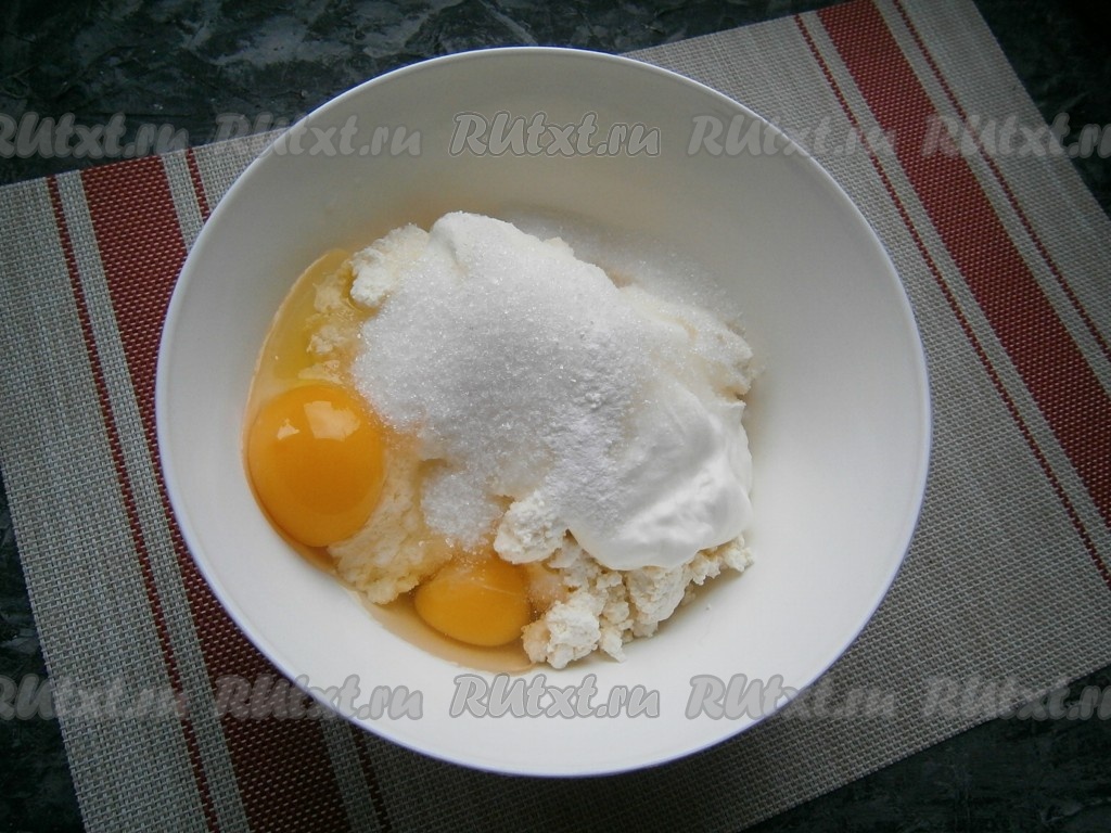 Пока тесто охлаждается, приготовить начинку: в творог добавить яйца, сметану, всыпать сахар и ванилин.