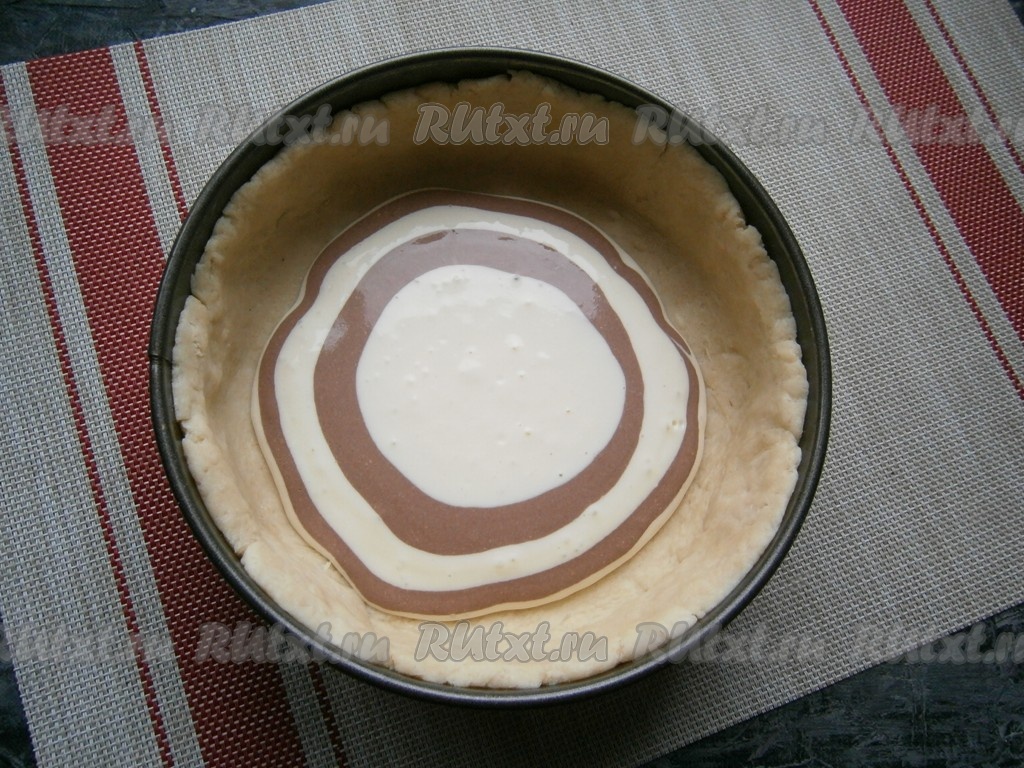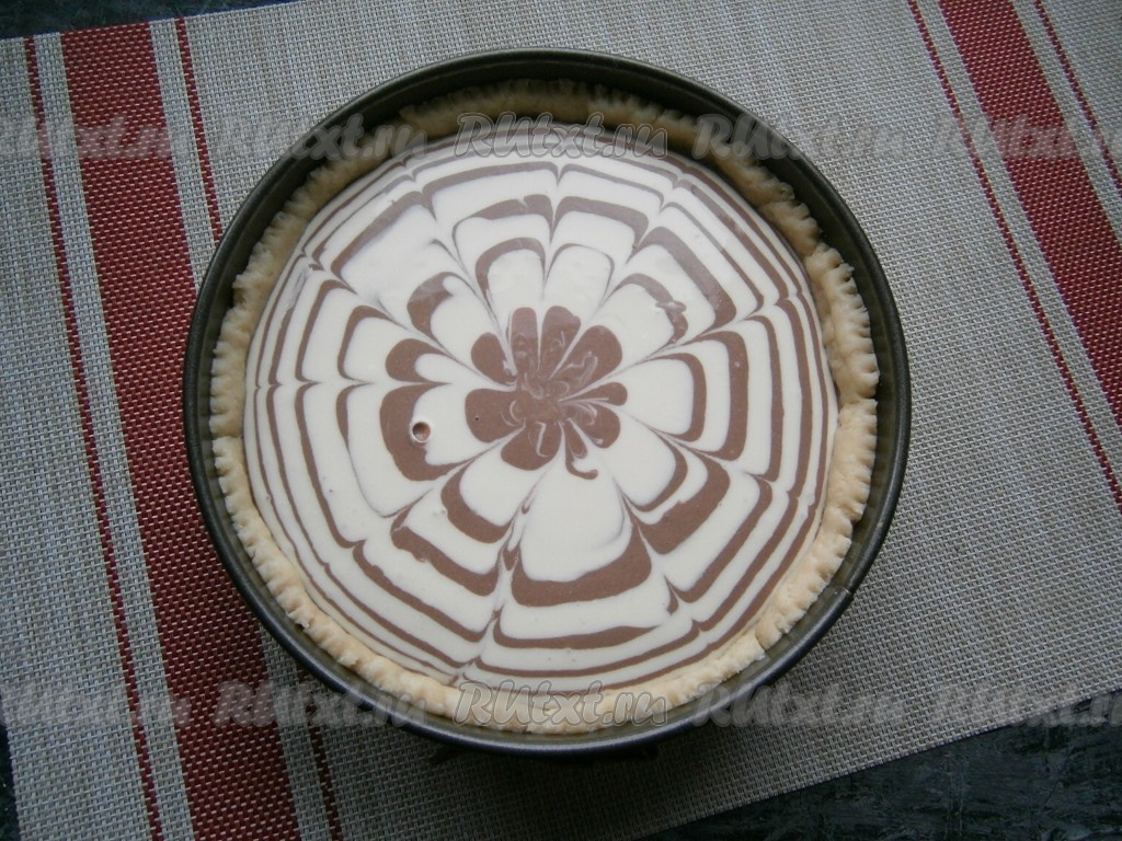 Когда закончатся обе смеси, на поверхности пирога зубочисткой сделать рисунок.