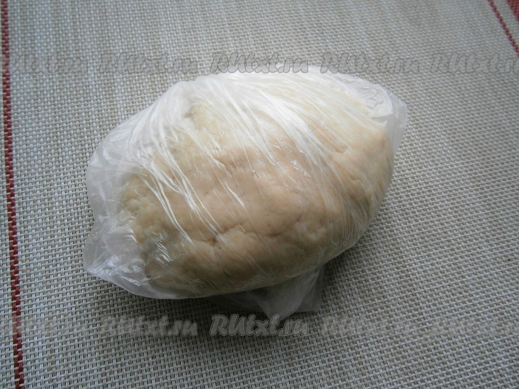 Затем влить ледяную воду и быстро замесить тесто, которое вначале будет рассыпаться и не собираться, но от тепла рук тесто должно стать плотным, однородным и собраться в однородный комок. Тесто поместить в целлофановый пакет (или обернуть плёнкой) и поместить в холодильник на 30 минут.