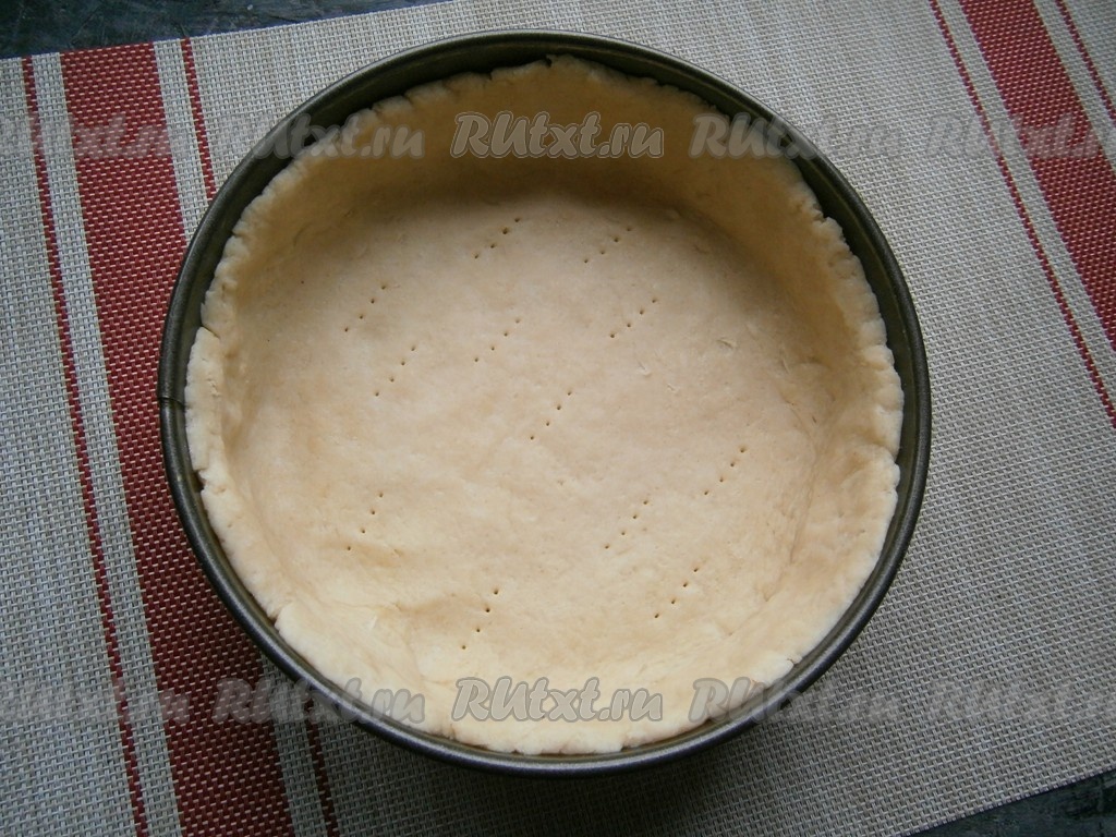 Дно разъемной формы диаметром 18-19 см застелить пергаментом. Тесто раскатать толщиной около 0,5 см и выложить его в форму, формируя высокие бортики. Дно наколоть вилкой.