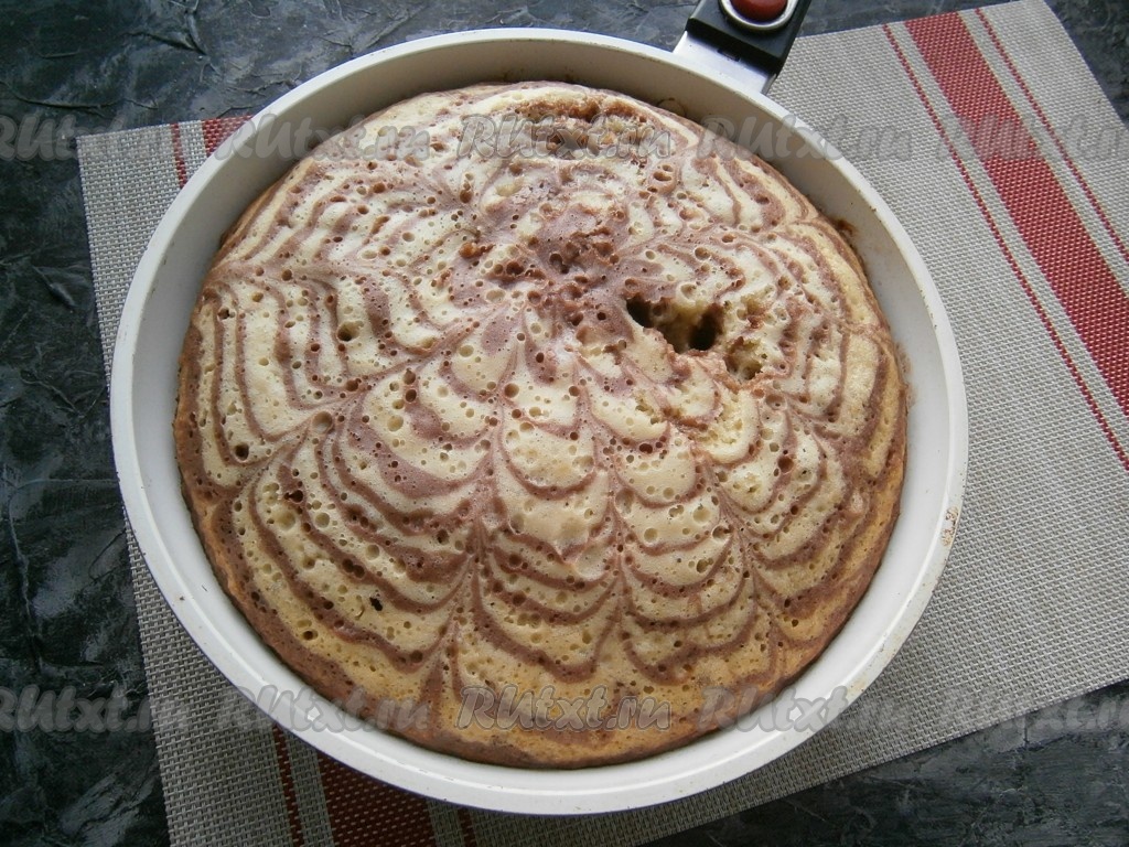 Поместить сковороду на самый маленький огонь, накрыть сковороду крышкой. Готовится пирог "Зебра" около 30-40 минут. Готовность можно проверить шпажкой или зубочисткой (при выходе из пирога она должна быть сухой). Пирог хорошо поднимается, именно поэтому сковороду лучше брать с высокими бортиками.