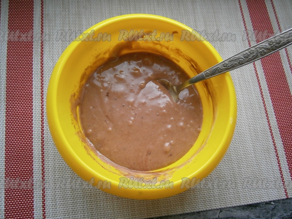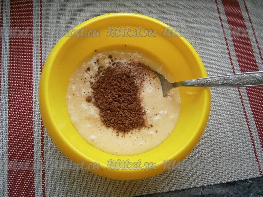 Тесто разделить на 2 равные части, разлив по двум глубоким мискам. В одну получившуюся часть теста добавить какао-порошок.