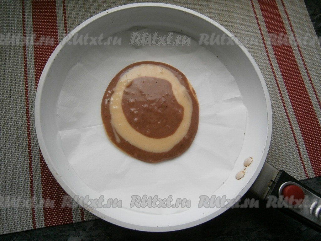 Дно сковороды с высокими бортиками диаметром 26 см застелить пергаментом. Выкладывать тесто в центр сковороды столовой ложкой поочередно: столовую ложку светлого, на него - столовую ложку тёмного.