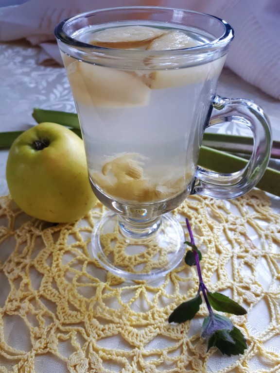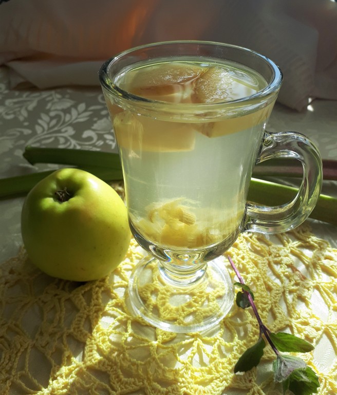 Вкусный, освежающий компот из ревеня и яблок готов. Напиток вкусен и в тёплом, и в охлаждённом виде.