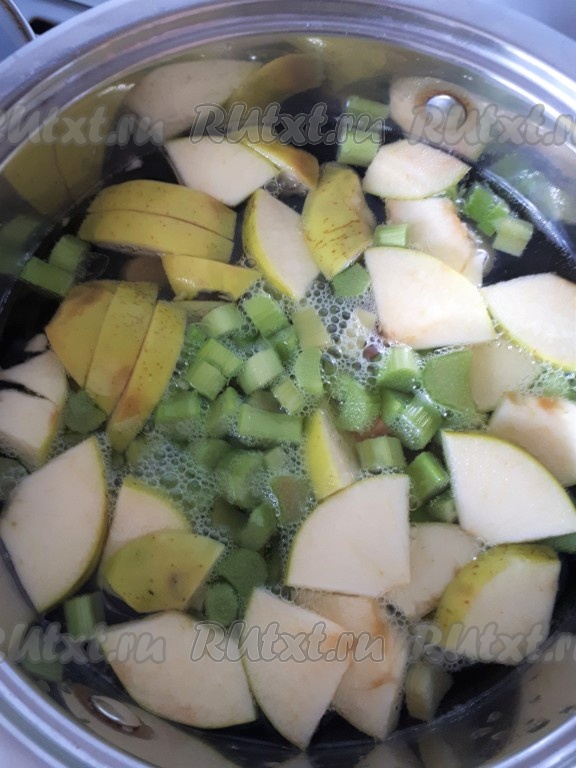 Воду довести до кипения. В кипящую воду положить сахар, ревень и яблоко, вновь довести до кипения, а затем варить компот 5 минут на небольшом огне.