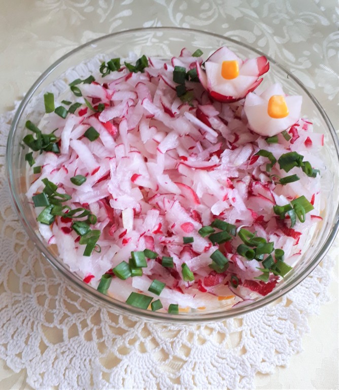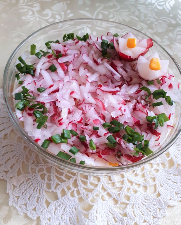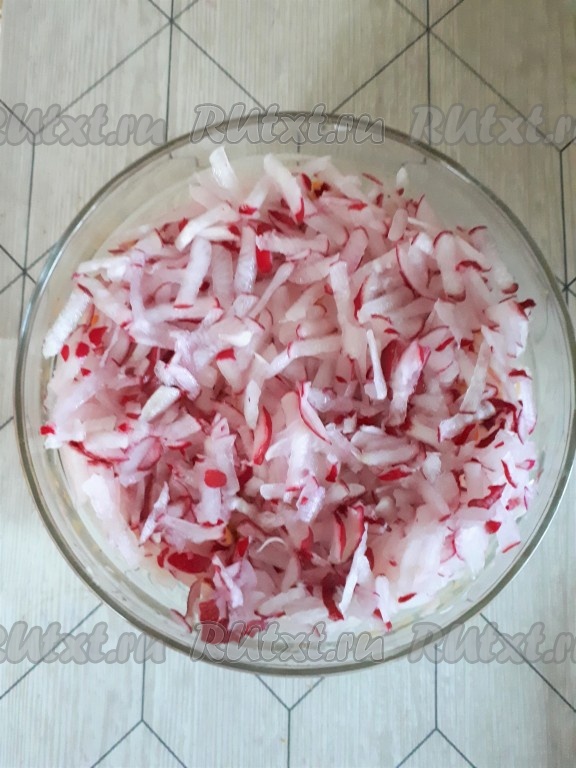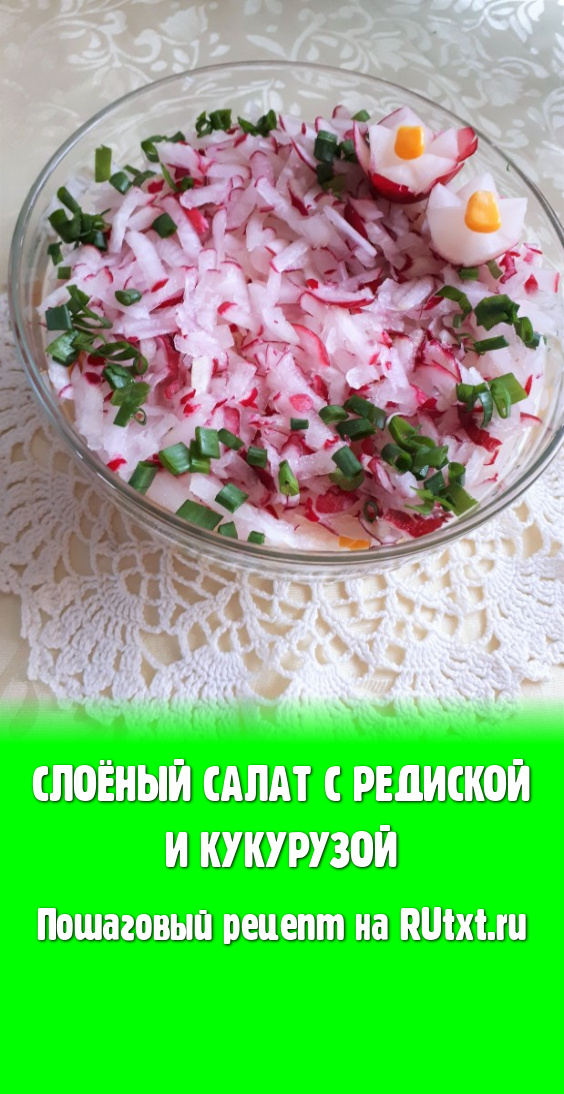 Салат с редисом, кукурузой, яйцами и сыром готов. Осталось лишь его украсить. Для этого лучше всего использовать продукты, которые входят в состав салата. Я посыпала зелёным луком и украсила редиской. Слоёный салат из редиски с кукурузой сразу готов к употреблению, он не требует настаивания, как большинство слоёных салатов.