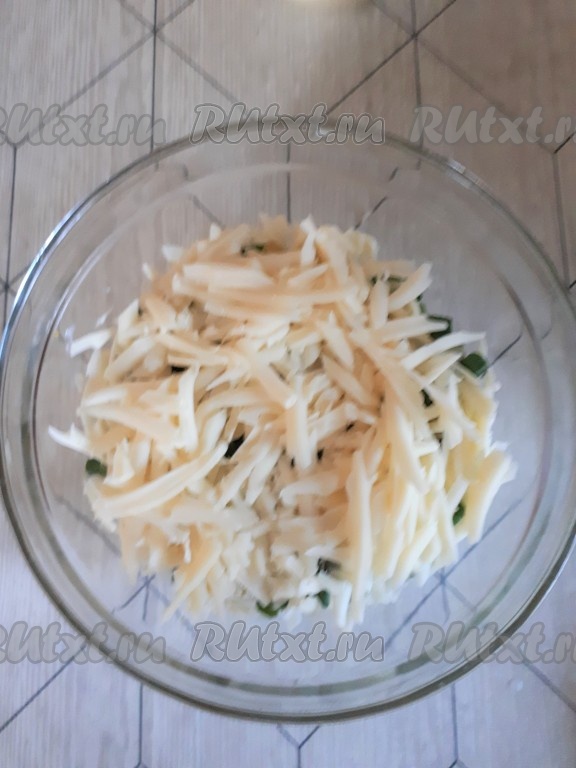 Сыр натереть на крупной тёрке и выложить в салатницу следующим слоем.
