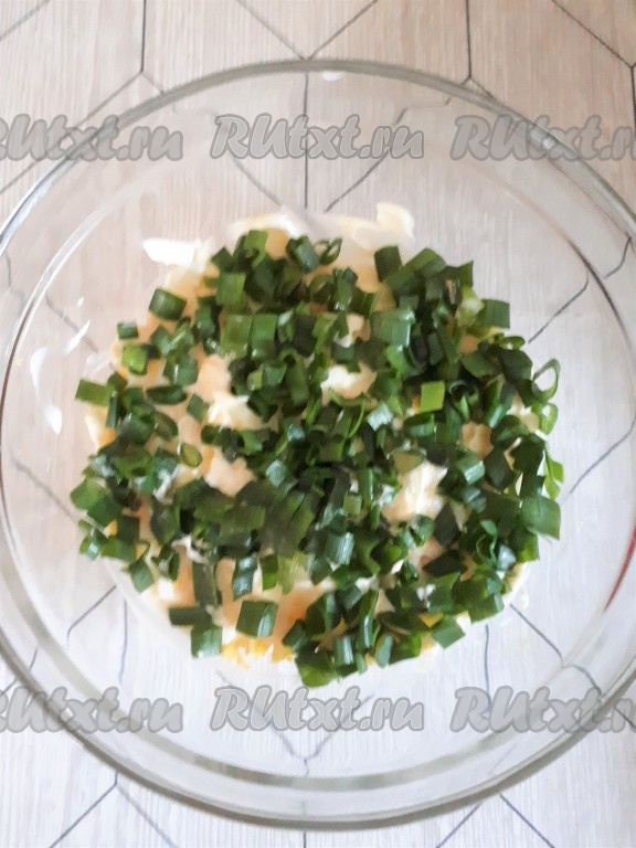 Зелёный лук мелко нарезать, выложить следующим слоем.