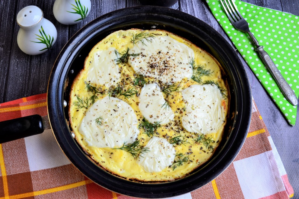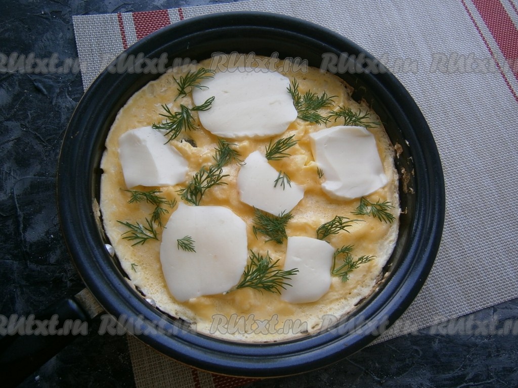 Готовить омлет на небольшом огне, немного лопаткой перемешивая, до тех пор, пока верх омлета не подсохнет. Сверху выложить ломтики моцареллы (или шарики) и веточки укропа.