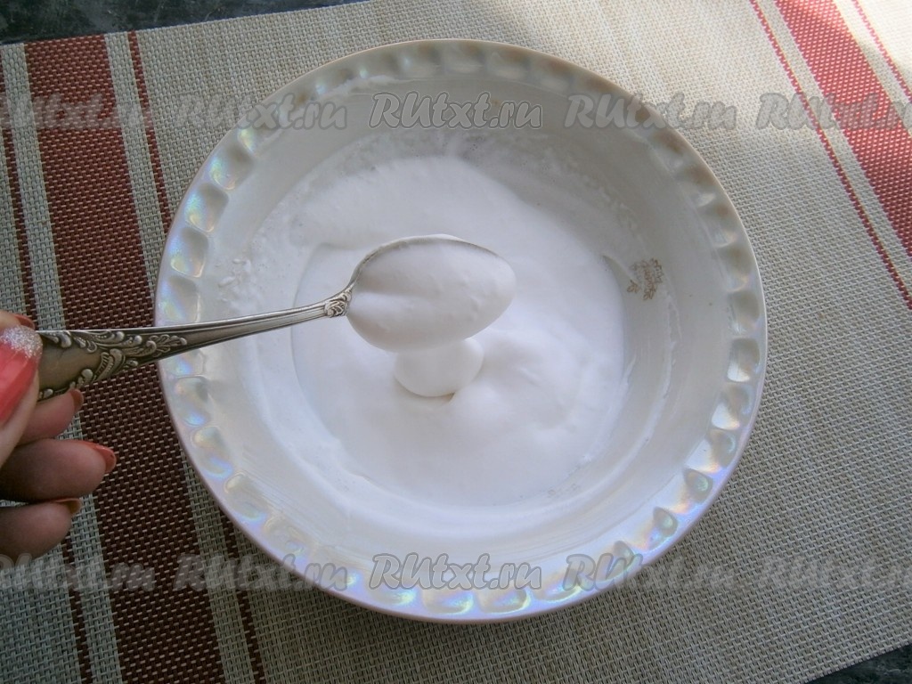 50 мл охлаждённых сливок взбить миксером, но не до устойчивых пиков, а до того состояния, когда сливки станут уже пышными, но будут стекать с ложки.