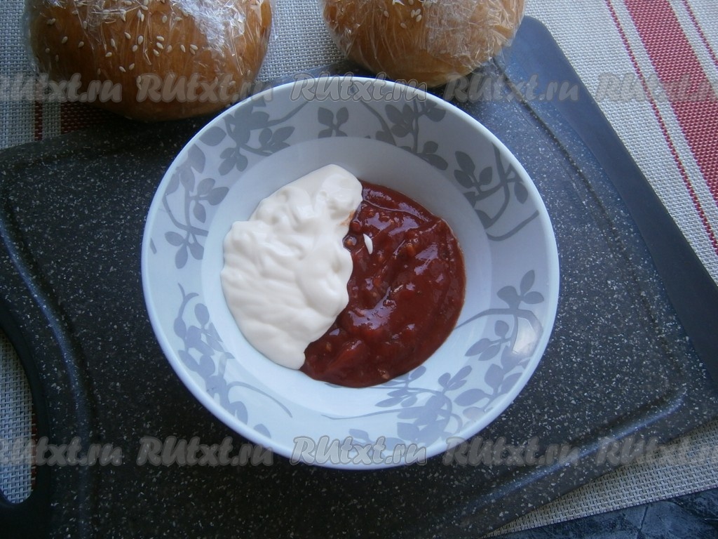 В миску выложить майонез, добавить кетчуп. У меня кетчуп острый, вы добавляйте тот, который нравится вам.
