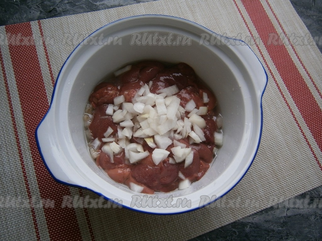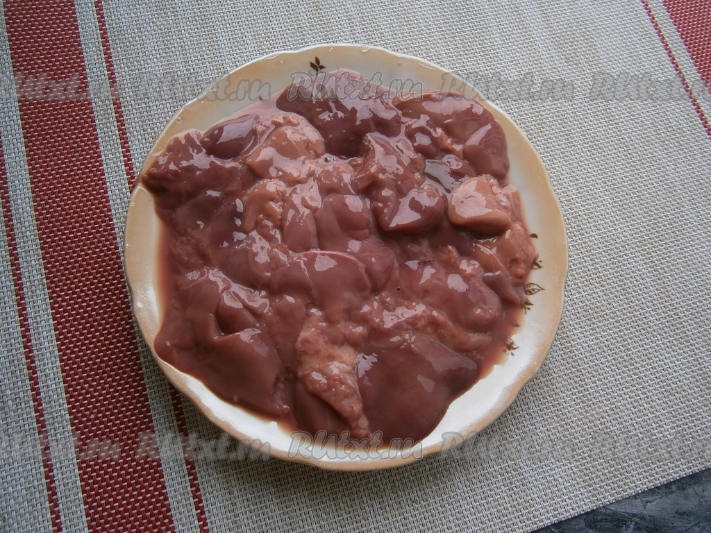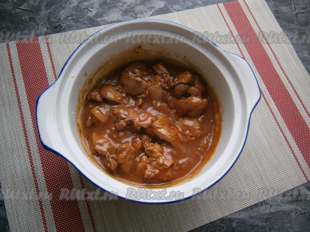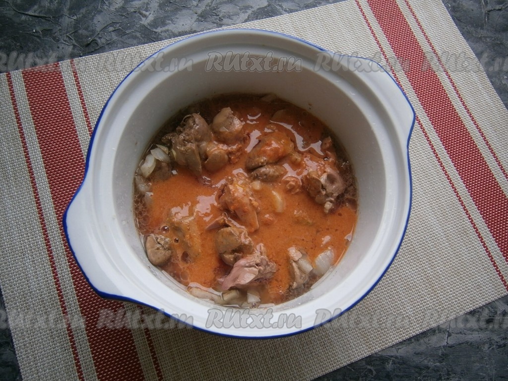 Немного куриную печень перемешать с соусом и готовить в микроволновке под закрытой крышкой 10 минут при мощности 750 Ватт.
