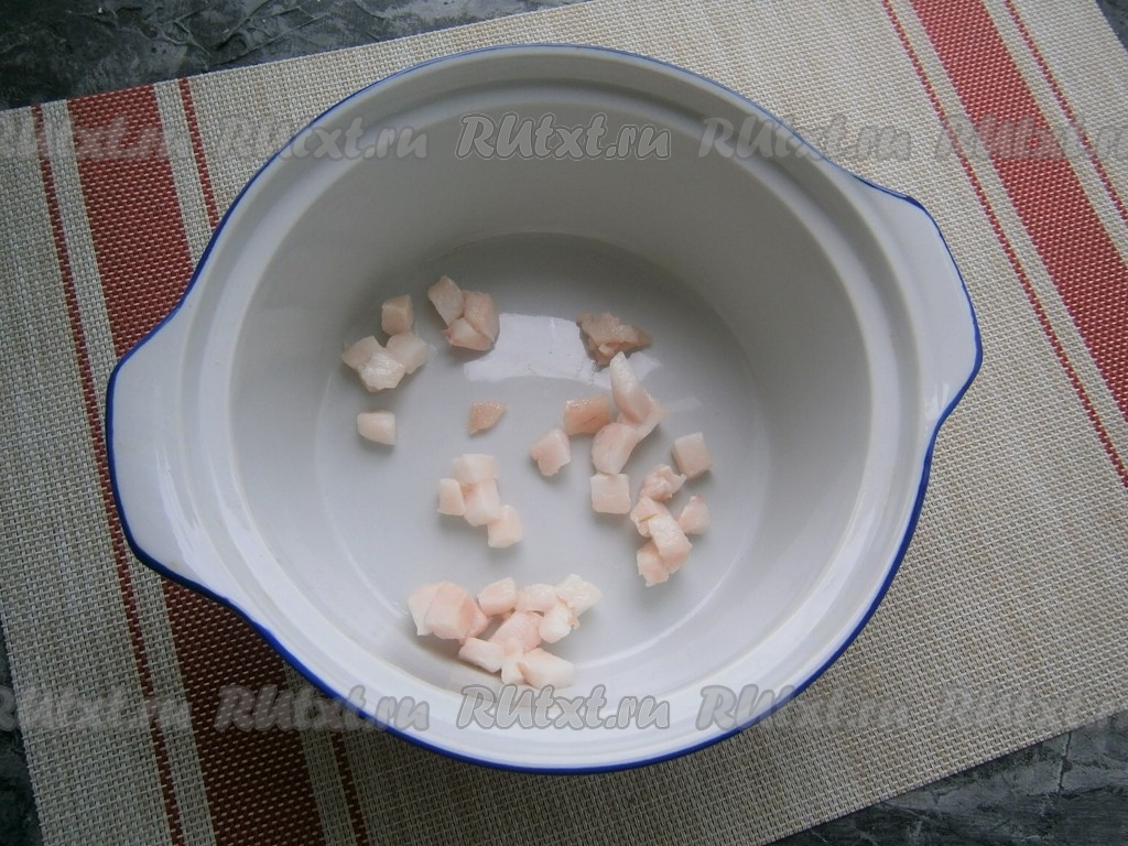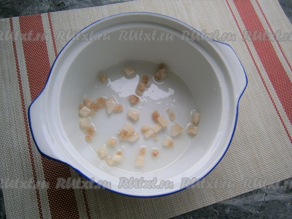 В кастрюльку, предназначенную для готовки в СВЧ, поместить маленькие кусочки свежего сала.