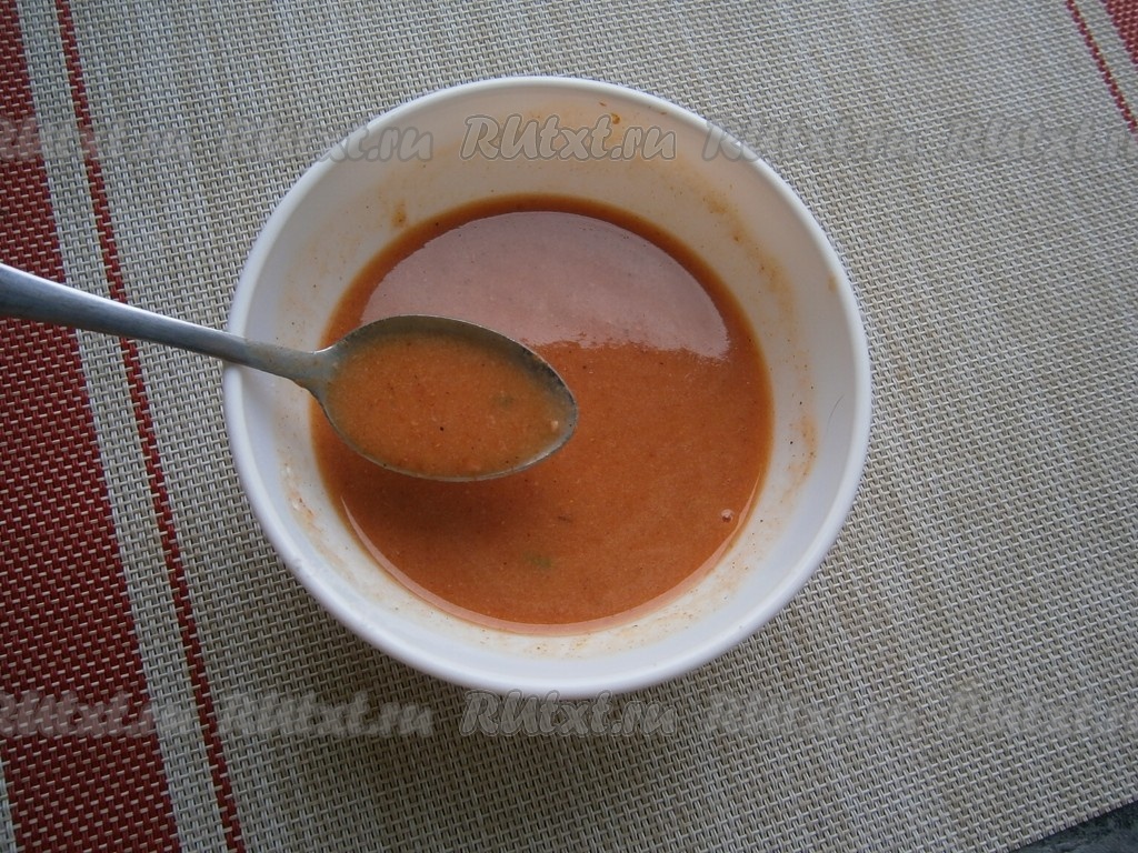 В мисочку с соусом влить бульон (или воду), тщательно перемешать до однородности.