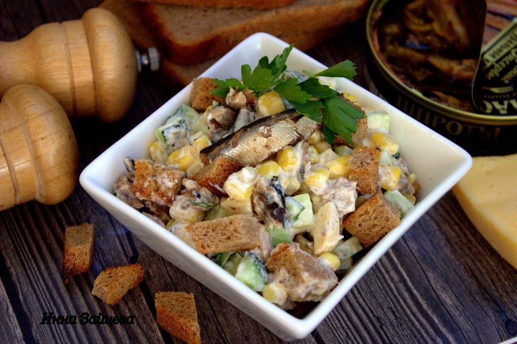 Пикантный, сытный салат из шпрот с сухариками и кукурузой подать к столу. Уверена, это вкусное блюдо понравится многим!