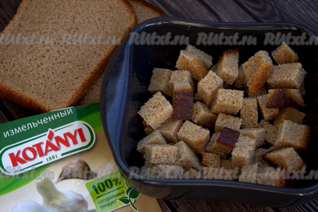 Ломтики чёрного хлеба нарезать на небольшие кубики, выложить в форму для запекания, по желанию, посыпать специями (у меня - гранулированный чеснок), перемешать, выложить в один слой на противень и отправить в заранее разогретую до 150 градусов духовку на 25-30 минут (время сушки зависит от размера сухарей, поэтому периодически проверяйте готовность сухариков и перемешивайте). Готовые сухарики достать из духовки и дать им остыть.