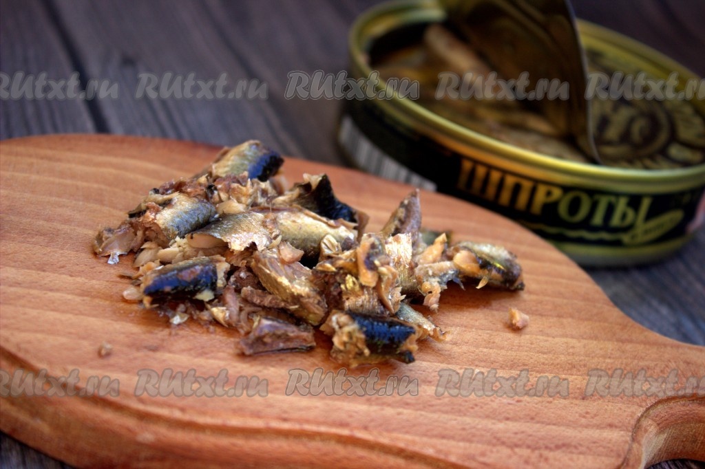 Открыть банку со шпротами, слить масло. Нарезать шпроты на небольшие кусочки.