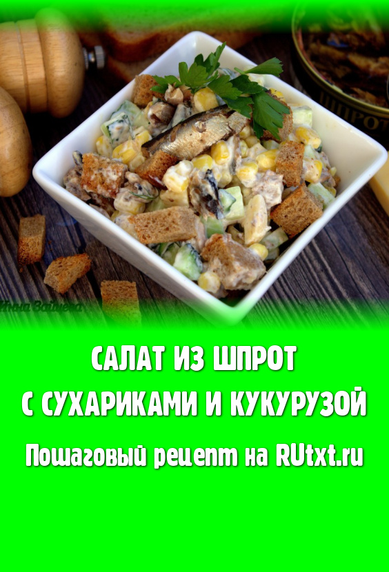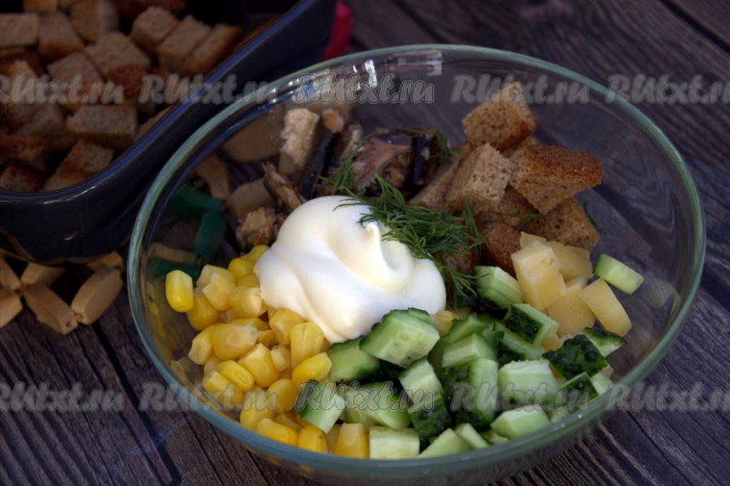 Предлагаю приготовить очень вкусный, сытный и пикантный салат из шпрот с сухариками и кукурузой. Сухарики можно купить в магазине, но я предпочитаю готовить их в домашних услвиях. Этот салат можно подать и в качестве холодной закуски, и в качестве дополнения к гарниру (особенно хорошо он сочетается с отварной картошкой). Приготовьте этот вкусный салатик и разнообразьте своё повседневное меню отличным блюдом!