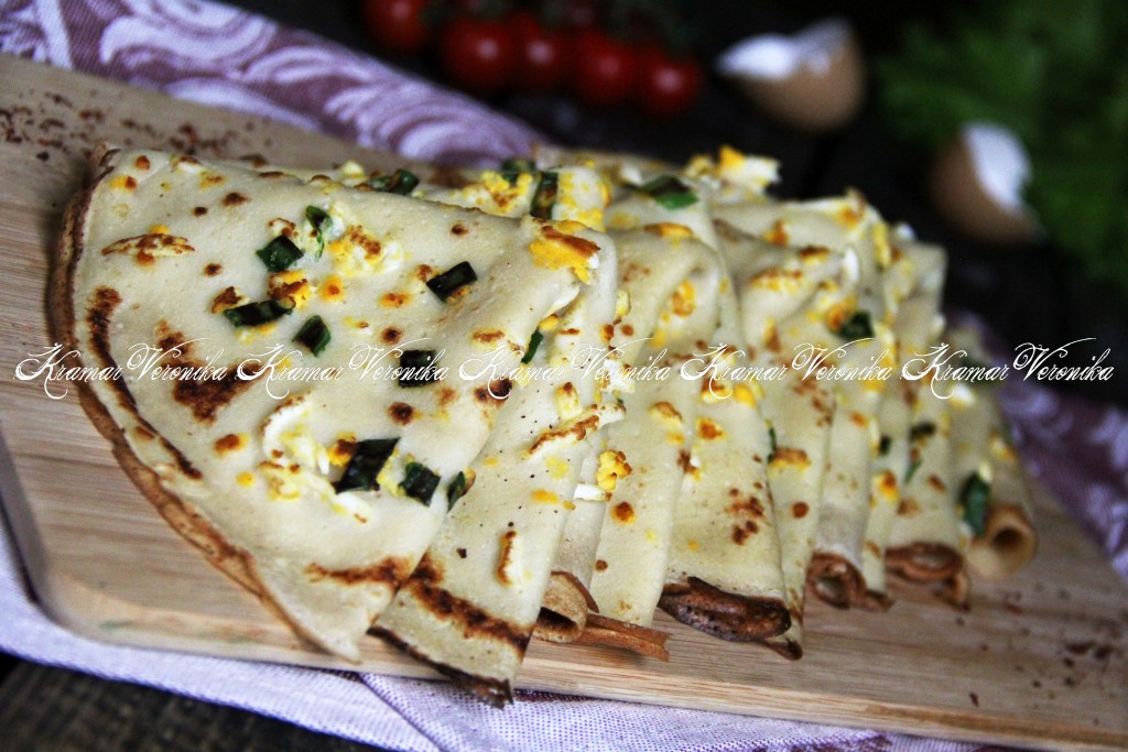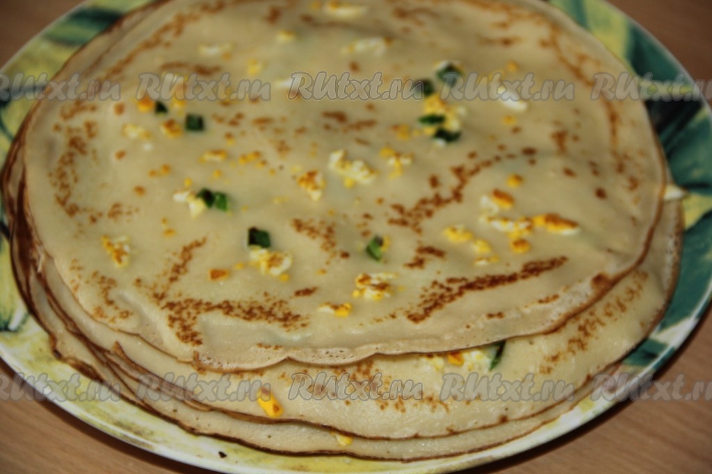 Вкусные и нежные блинчики с припёком из яиц и лука понравятся взрослым и детям.