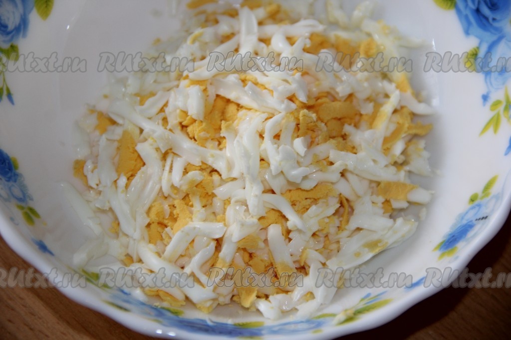 Яйца для припёка предварительно отварить в течение минут 10 с момента закипания воды, затем охладить их, очистить и натереть на крупной тёрке.
