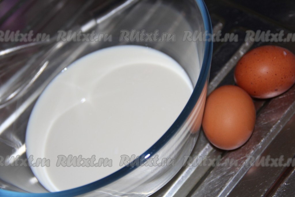 Перемешать молоко с яйцами венчиком, затем всыпать муку.