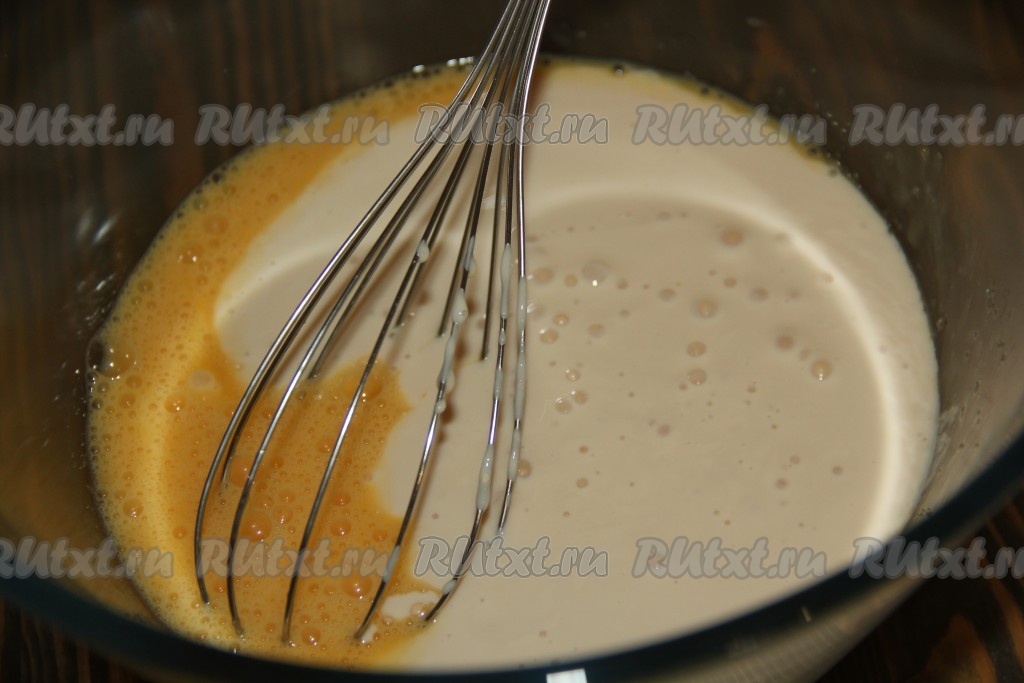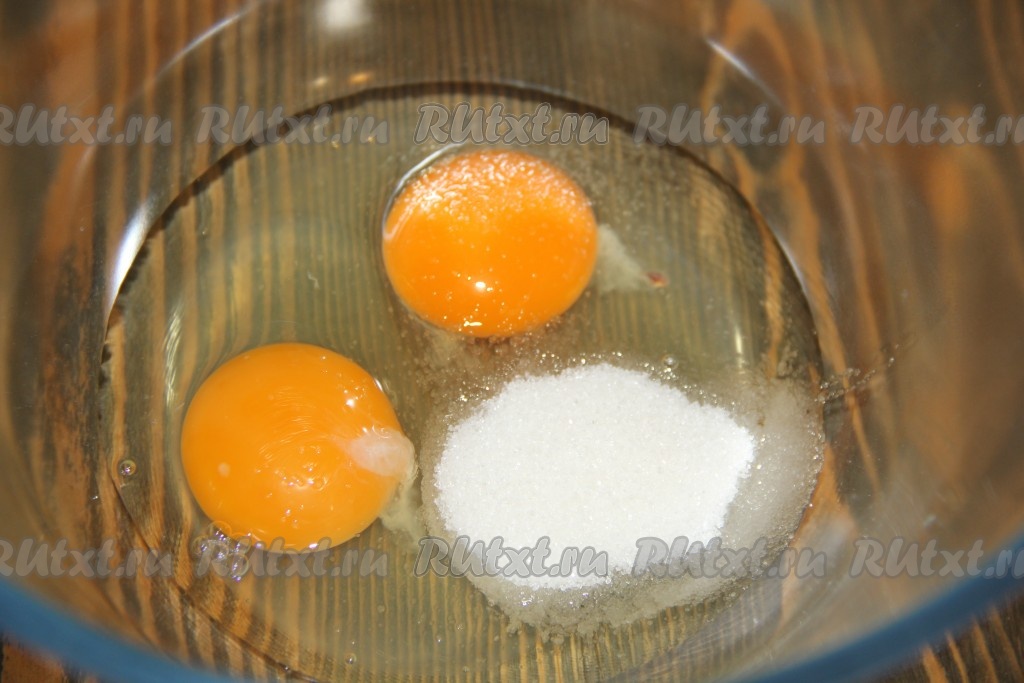 Соединить в миске яйца и сахар, перемешать венчиком.