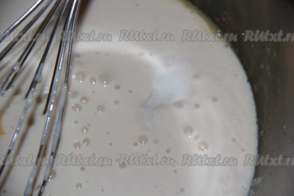Затем влить ряженку, добавить соль и соду, перемешать и оставить на 5 минут.