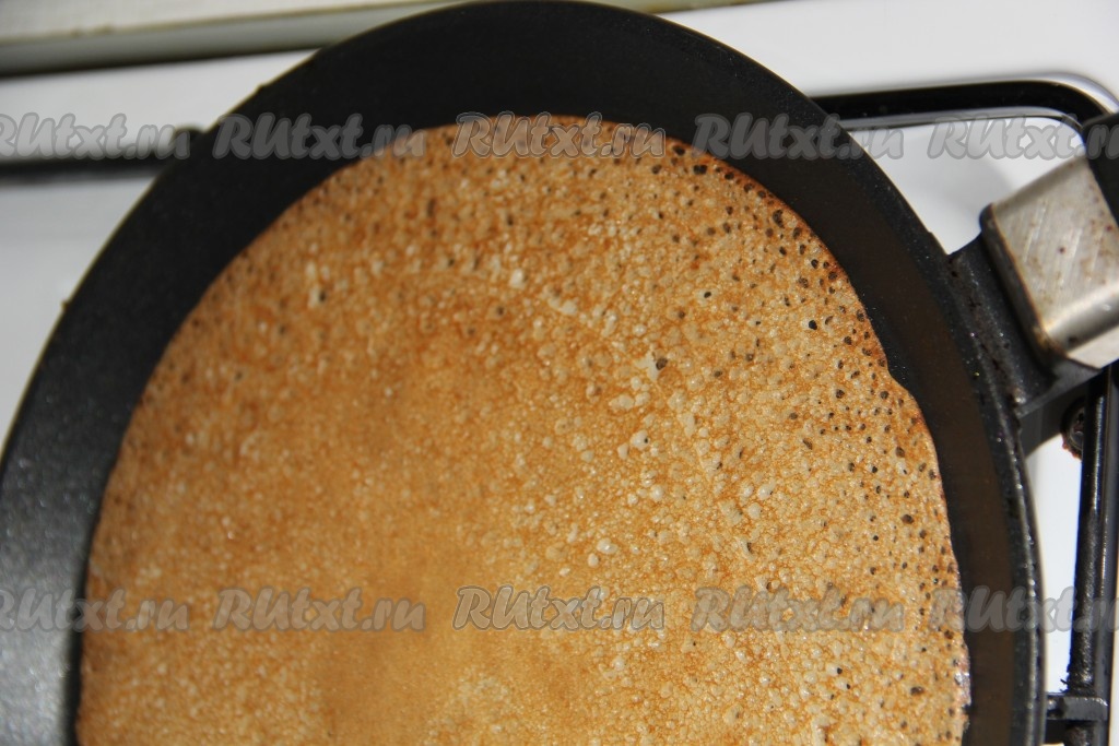 На хорошо разогретую сковороду (перед жаркой первого блинчика можно, по желанию, смазать сковороду маслом) влить часть теста, затем равномерно его распределить и жарить блин с двух сторон до золотистого цвета на среднем огне. В процессе жарки на поверхности блинчика появятся небольшие дырочки. Готовый блин переложить на тарелку. Таким образом пожарить оставшиеся блины, складывая их постепенно аппетитной стопочкой на тарелку.