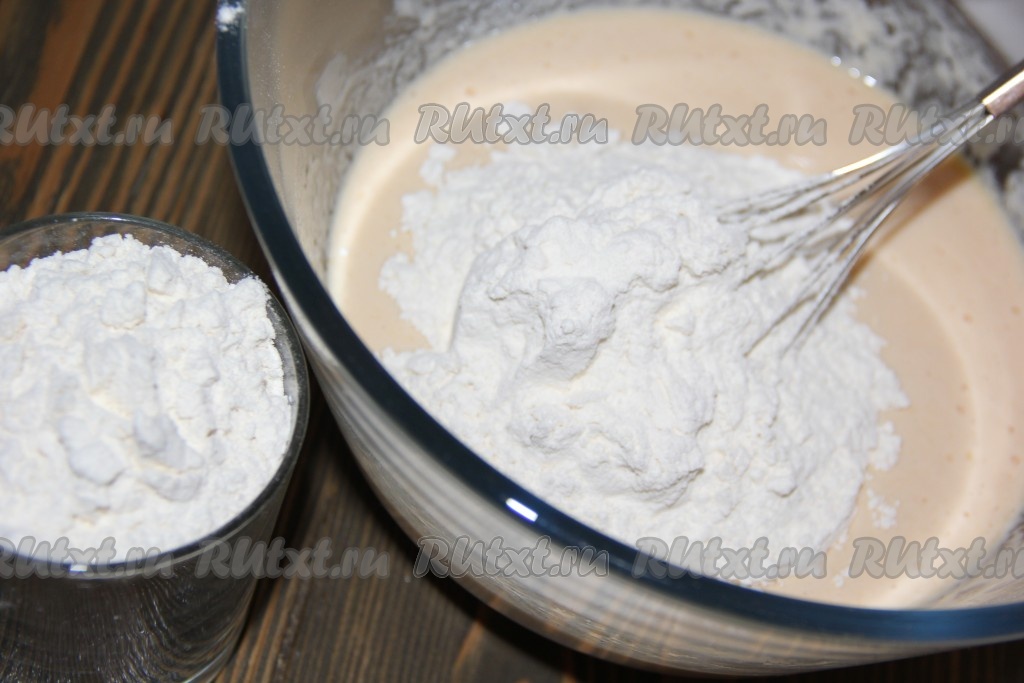 Небольшими порциями всыпать муку и тщательно перемешать венчиком.