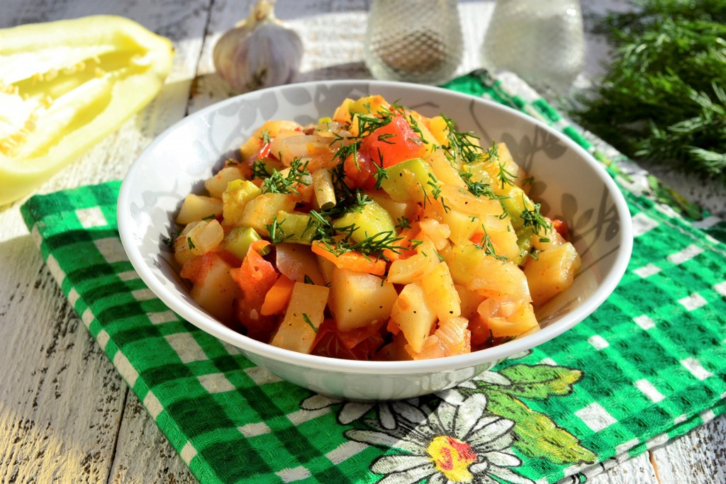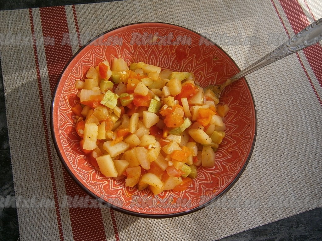 По прошествии времени овощное рагу будет готово, достаём его из микроволновки. Все овощи получаются мягкими, но остаются целенькими.