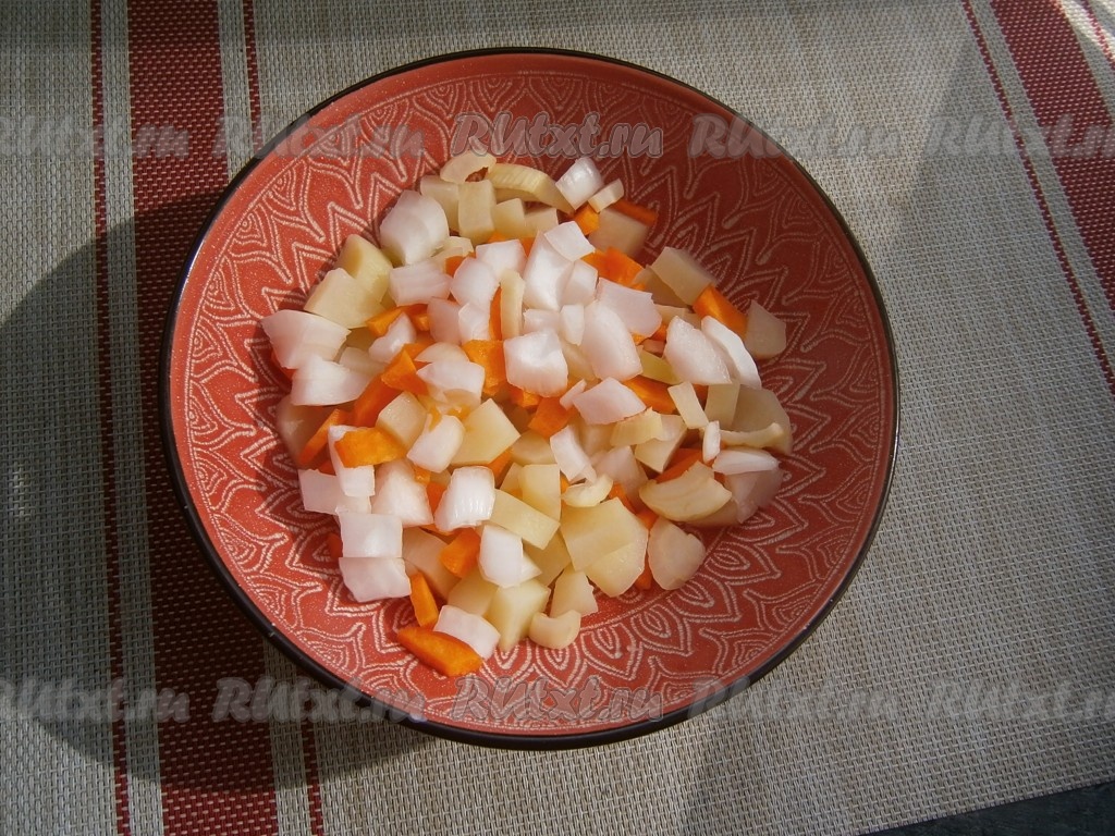 Картошку, морковь, чеснок и лук очистить от кожуры. Удалить плодоножку с семенами из болгарского перца. Если у кабачка нежная кожица и маленькие семечки, их можно оставить и готовить вместе с ними. В глубокую толстостенную миску, которая пригодна для готовки в микроволновке, выложить картофель, нарезанный небольшими кубиками, затем влить воду и отправить в СВЧ на 5 минут при мощности 750 Ватт, прикрыв миску крышкой с выходом пара.