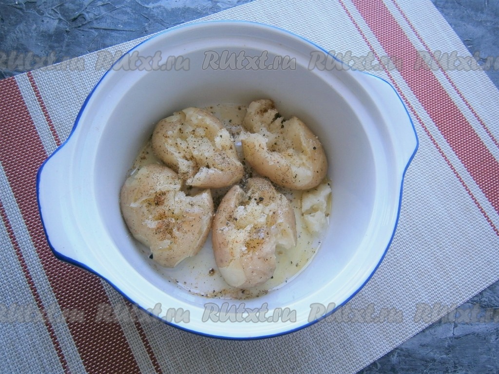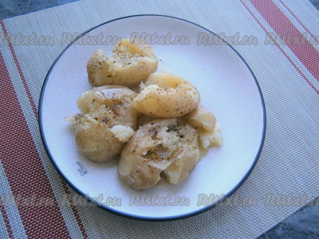 Накрыть кастрюльку крышкой, поставить в микроволновку, выставить время 10 минут с мощностью 750-800 Ватт. Затем воду слить, а молодую картошку придавить толкушкой или вилкой (не слишком сильно), посолить, посыпать приправой и сушёными травами, полить оливковым маслом.